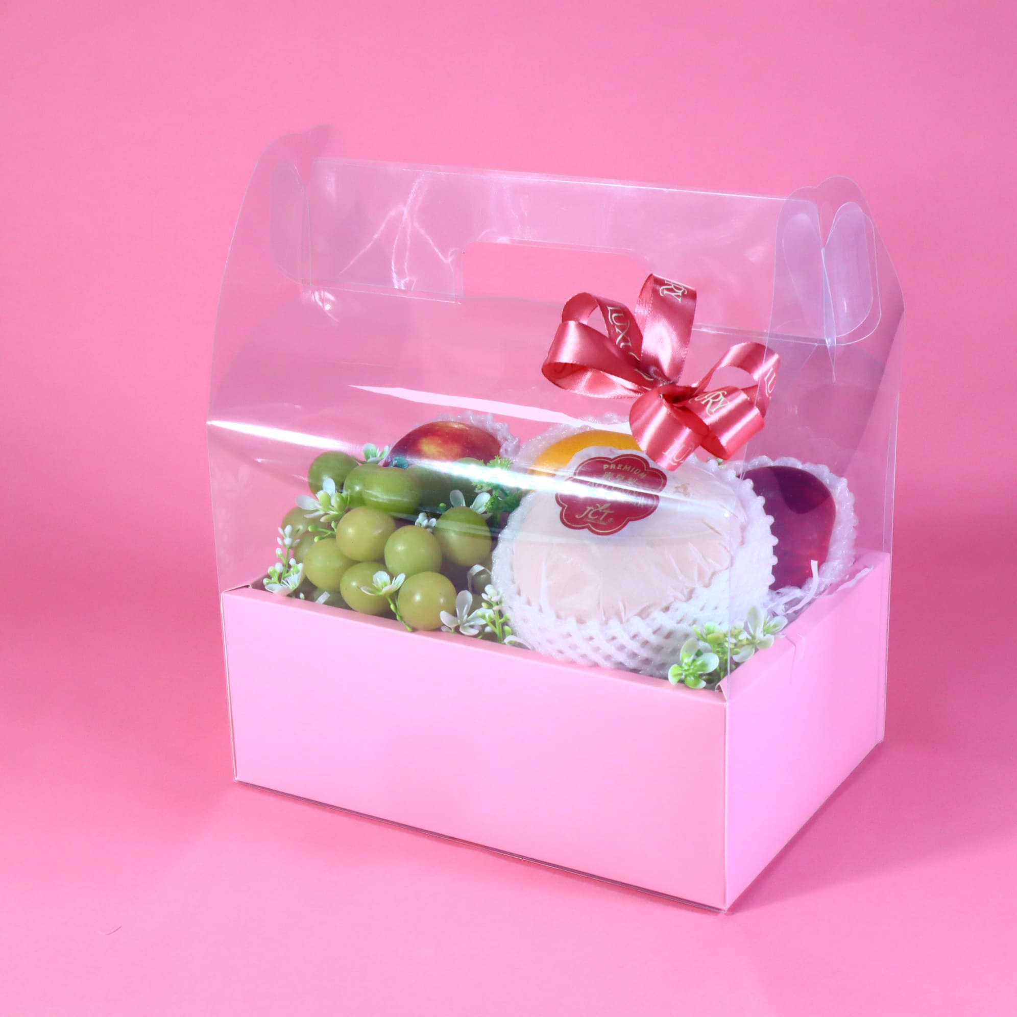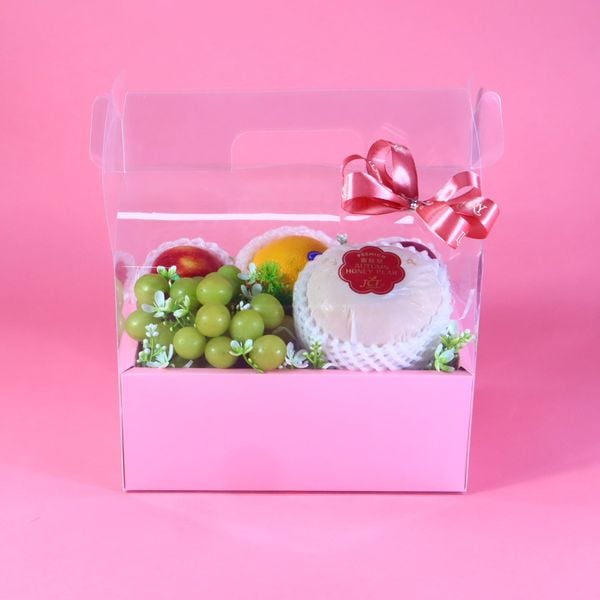 - Xách quà mica tone hồng: thiết kế sang trọng, tinh tế, mang gam màu nữ tính, nhẹ nhàng – hoàn thiện vẻ đẹp tổng thể cho giỏ quà.